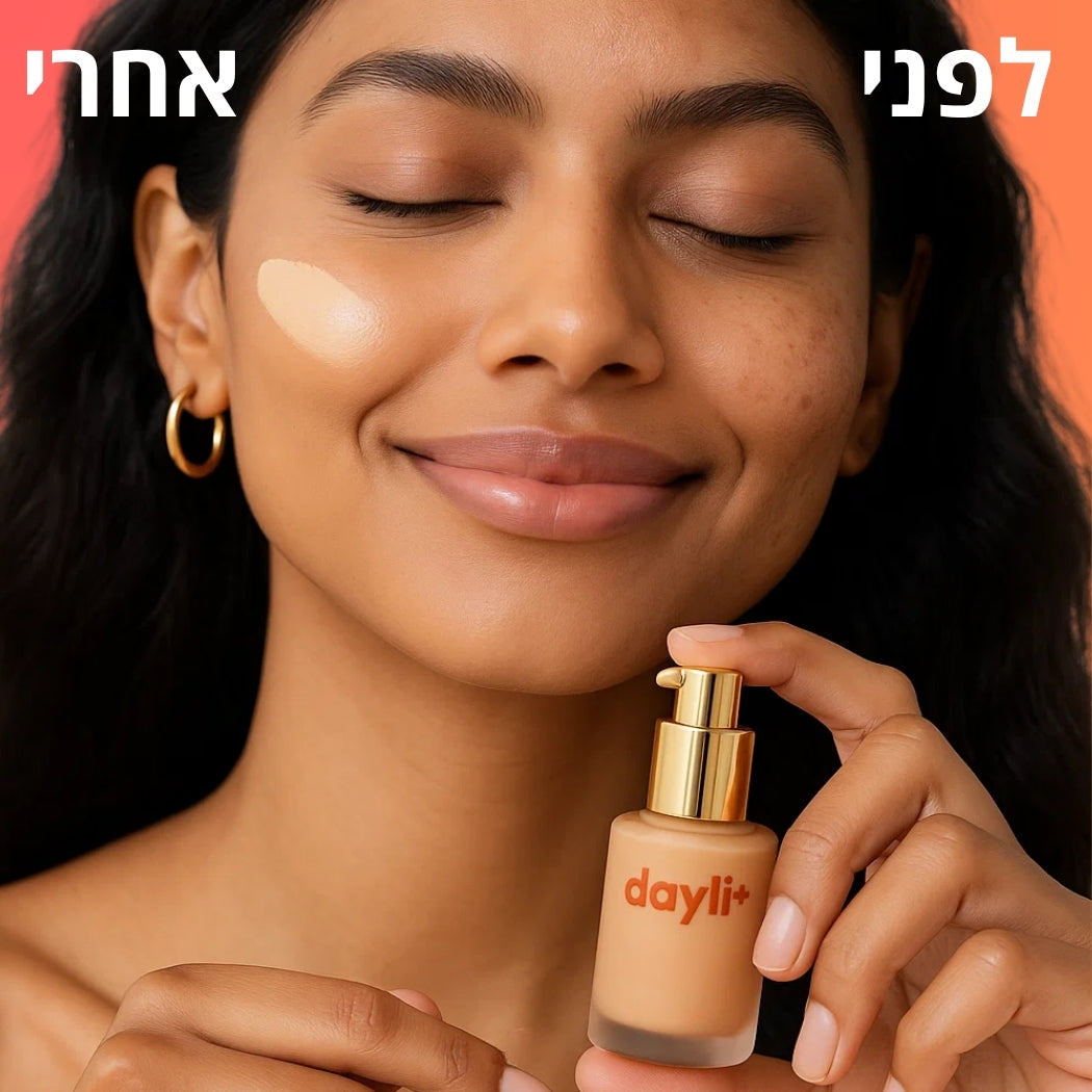 בכלל לא! הפורמולה הקלילה שלנו נושמת עם העור ולא תרגישי שיש משהו על הפנים. היא ניתנת לבנייה בשכבות - אז את יכולה להוסיף כיסוי במקומות שצריך, בלי שזה ירגיש כבד או יראה "cakey". התוצאה? גימור חלק וזוהר שנראה כמו עור אמיתי - לא מסכה. העור שלך ממשיך לנשום, ואת ממשיכה להיראות מדהימה.